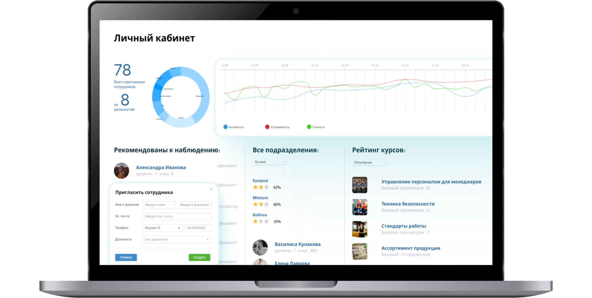 С помощью ServiceGuru руководители формируют базу знаний, проводят аттестации и тестирования, а также отслеживают успеваемость персонала в личном кабинете. Все изменения в меню, правилах работы или сервисных стандартах мгновенно доводятся до сотрудников через ленту новостей.