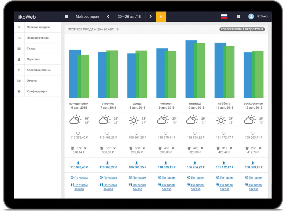 Автоматически создавать прогноз продаж. Будущее наступило, теперь в онлайн режиме вы будете видеть примерный план по продажам в вашем ресторанном проекте. Система прогнозирует падение или всплеск динамики в соответствии с погодой, грядущими праздниками и, конечно, опираясь на предыдущие периоды работыю.