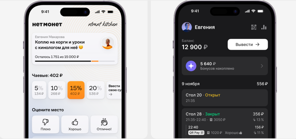 Гость оставляет чаевые через нетмонет безналичным способом, сотрудники могут сами переводить чаевые на карту любого банка без комиссии. Можно настроить индивидуальные или командные чаевые, а также автоматически начислять процент другим подразделениям. Такая прозрачная мотивация важна для мотивации и удержания сотрудников. Также гости могут оплатить счет без помощи официанта по QR-коду и оставить отзыв.