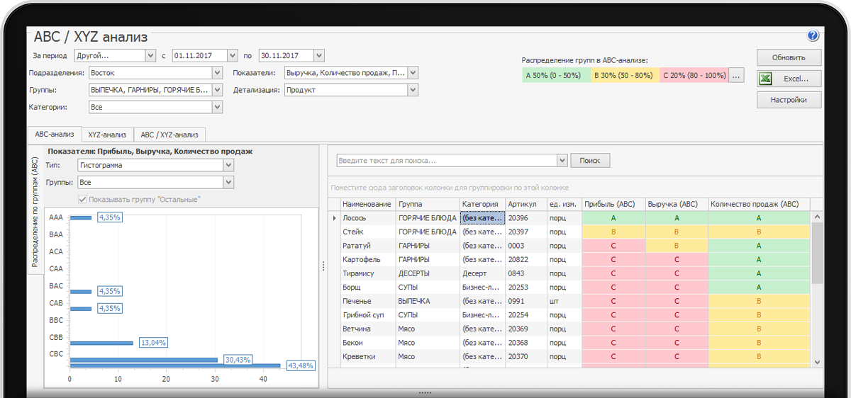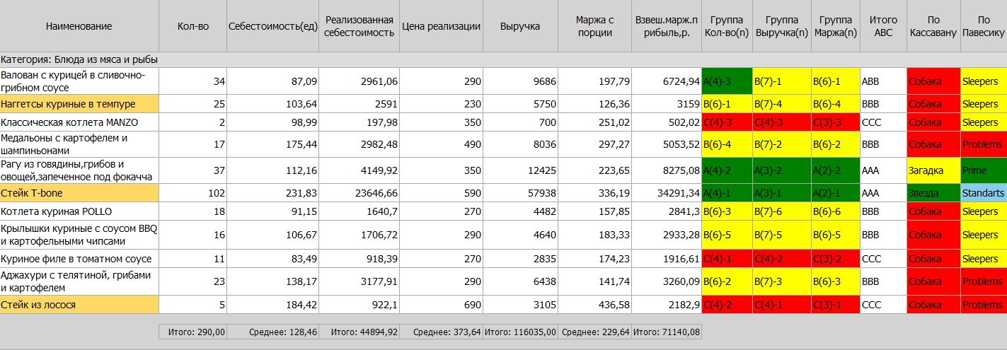 Анализ продаж по трем методикам для выведения из продаж блюд с низким спросом, усиления продаж по высокомаржинальным позициям.