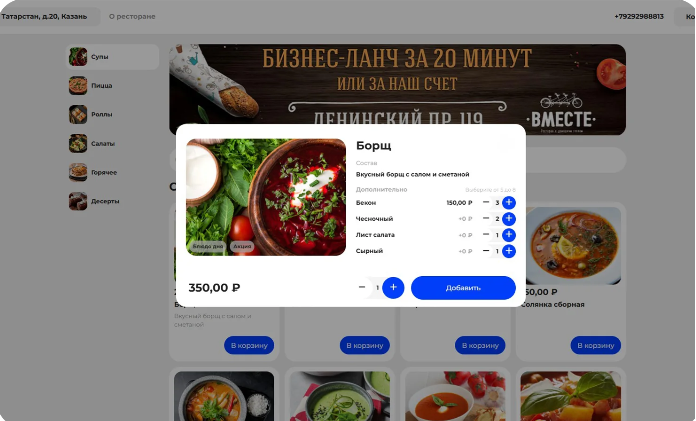 - Рекомендации для увеличения среднего чека: дополнительные блюда предлагаются при просмотре карточки или в корзине.