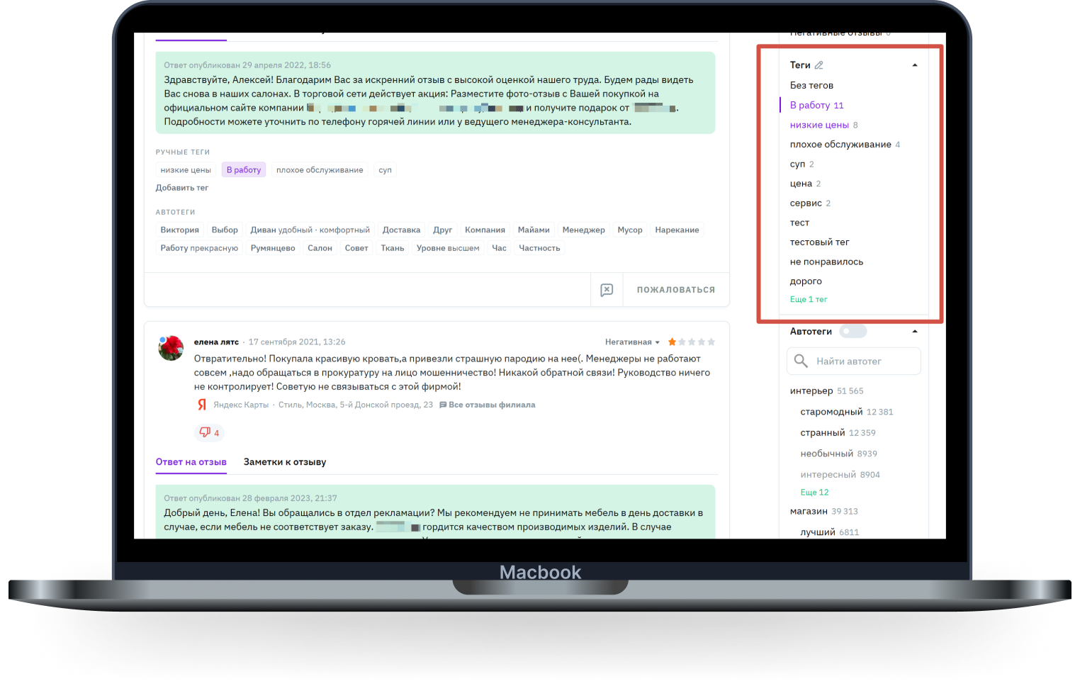 Программа позволяет сортировать и анализировать отзывы по тегам. Благодаря этому вы видите общую картину обратной связи